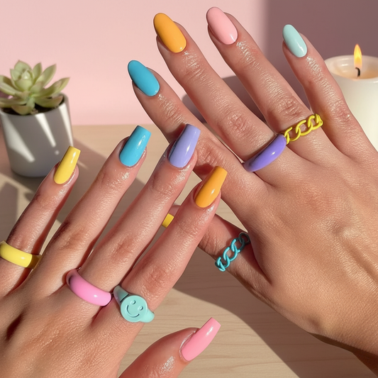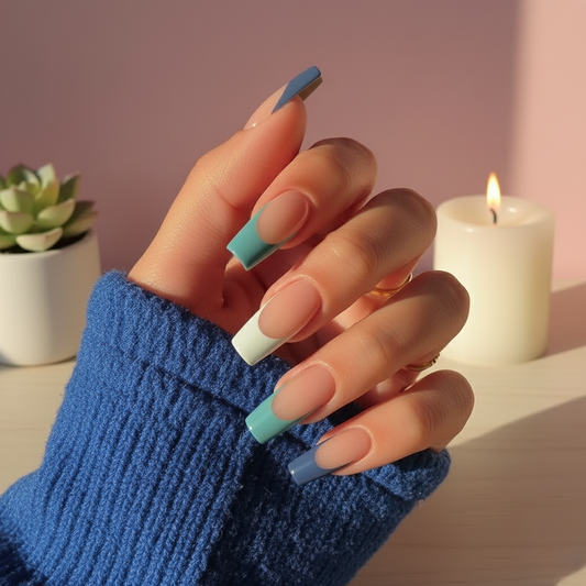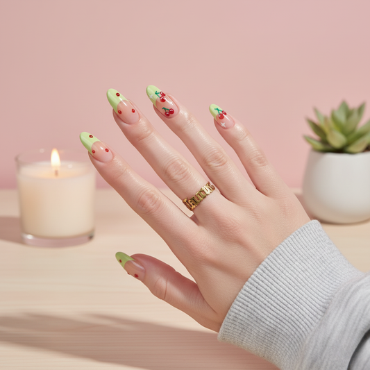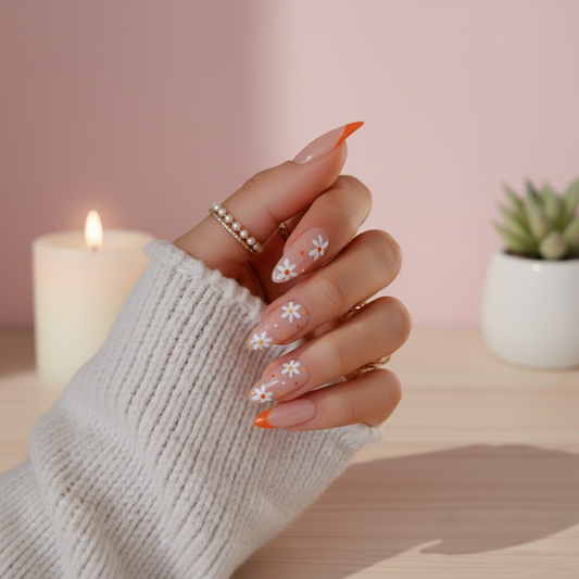Spring, French Tips with Nail Glue + Nail Glue Sticker | Medium, Almond Press-On Nails